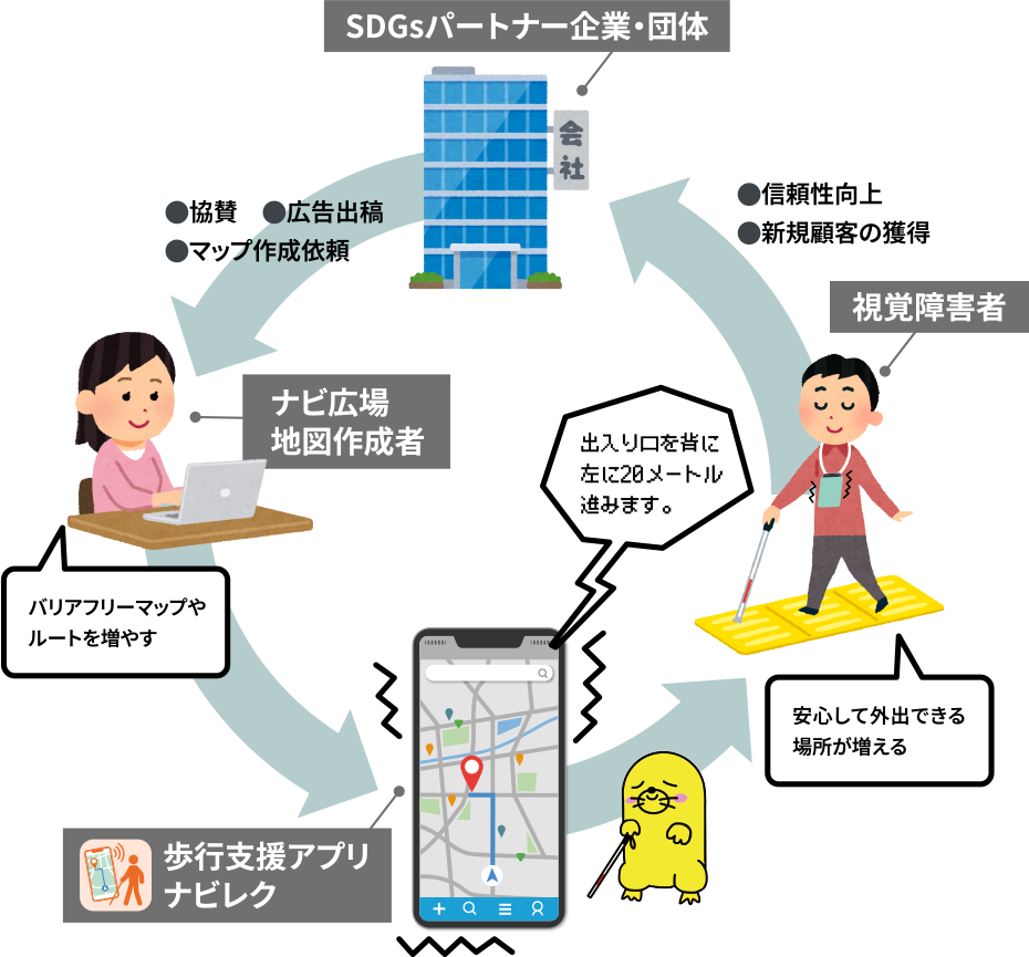 視覚障害者とバリアフリーマップの作成者をつなぐプラットフォーム「ナビ広場」の運営・保守・維持に活用されます。